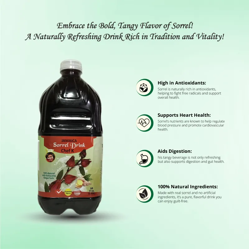 Chef K Sorrel Drink in the 64 oz family-size bottle offers an authentic taste of Jamaican sorrel. This rich, tangy beverage is made from fresh sorrel flowers (hibiscus) and is packed with antioxidants and Vitamin C, supporting immune health naturally. The 64 oz bottle is perfect for sharing with family and friends at gatherings, meals, or celebrations. Whether served cold over ice or warm during festive occasions, this naturally gluten-free drink is a healthy and flavorful choice that brings a touch of Jamaican tradition to your table.