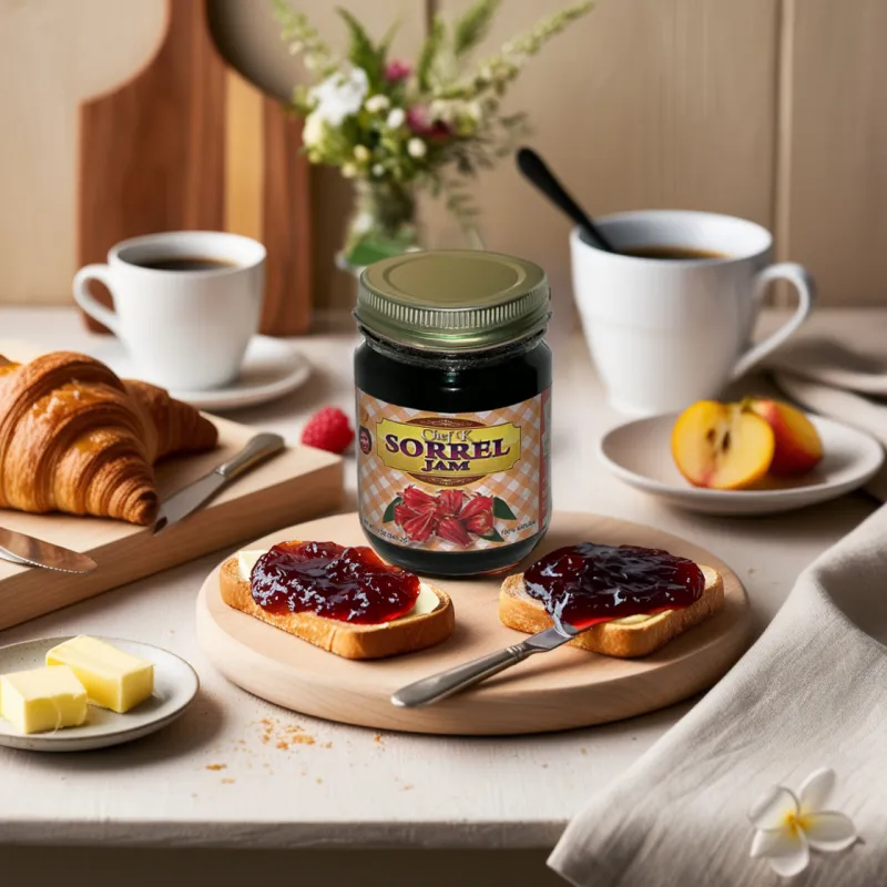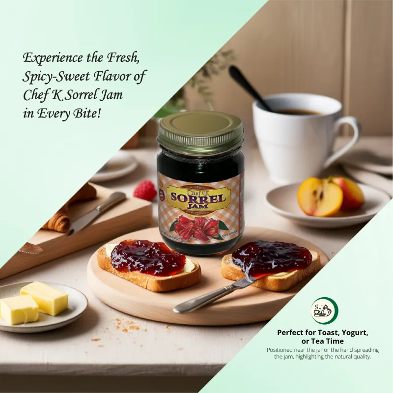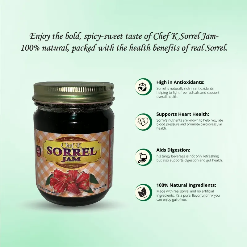 Chef K Sorrel Jam brings the vibrant flavor of sorrel flowers to your table. This deep red, naturally tangy jam is bursting with Vitamin C, making it a delicious and nutritious addition to your daily meals. Whether you're using it as a spread, a dessert topping, or mixing it into beverages, Chef K Sorrel Jam delivers a refreshing twist with every bite. Crafted with care, it's free from preservatives and artificial ingredients, offering pure flavor in every jar.