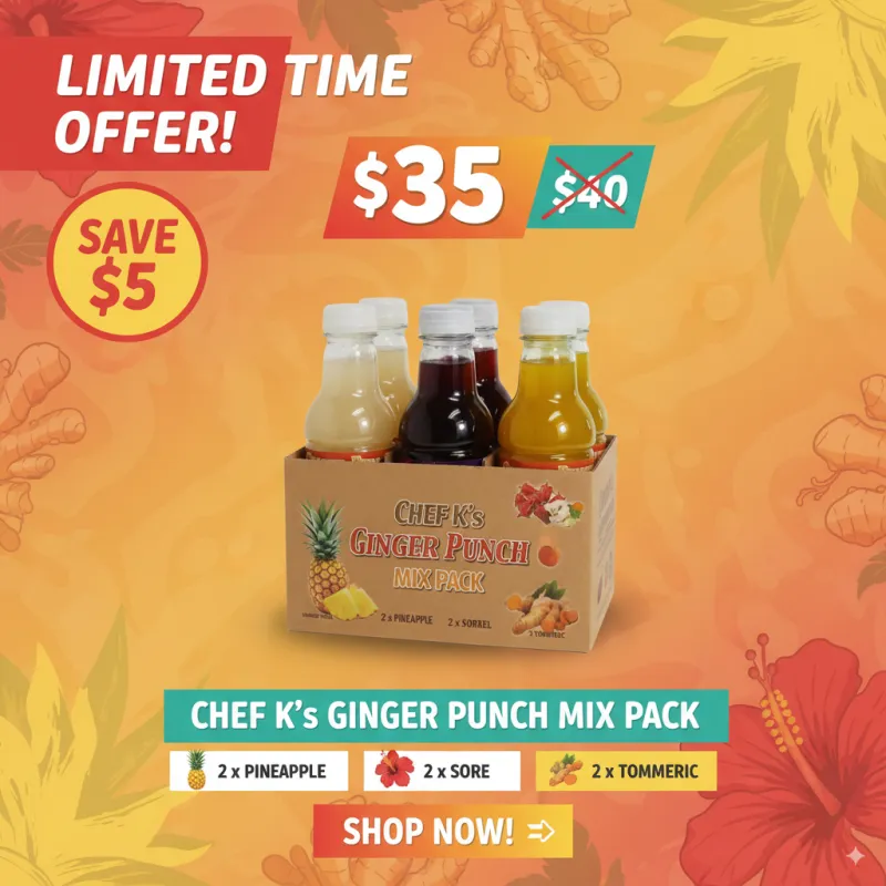 Discover the refreshing taste of tradition with Chef K’s Ginger Punch Mix Pack. This carefully curated 6-pack brings together three of our most loved flavors in one convenient box. Brewed with fresh roots, flowers, and fruits, every sip delivers a natural burst of flavor and wellness.